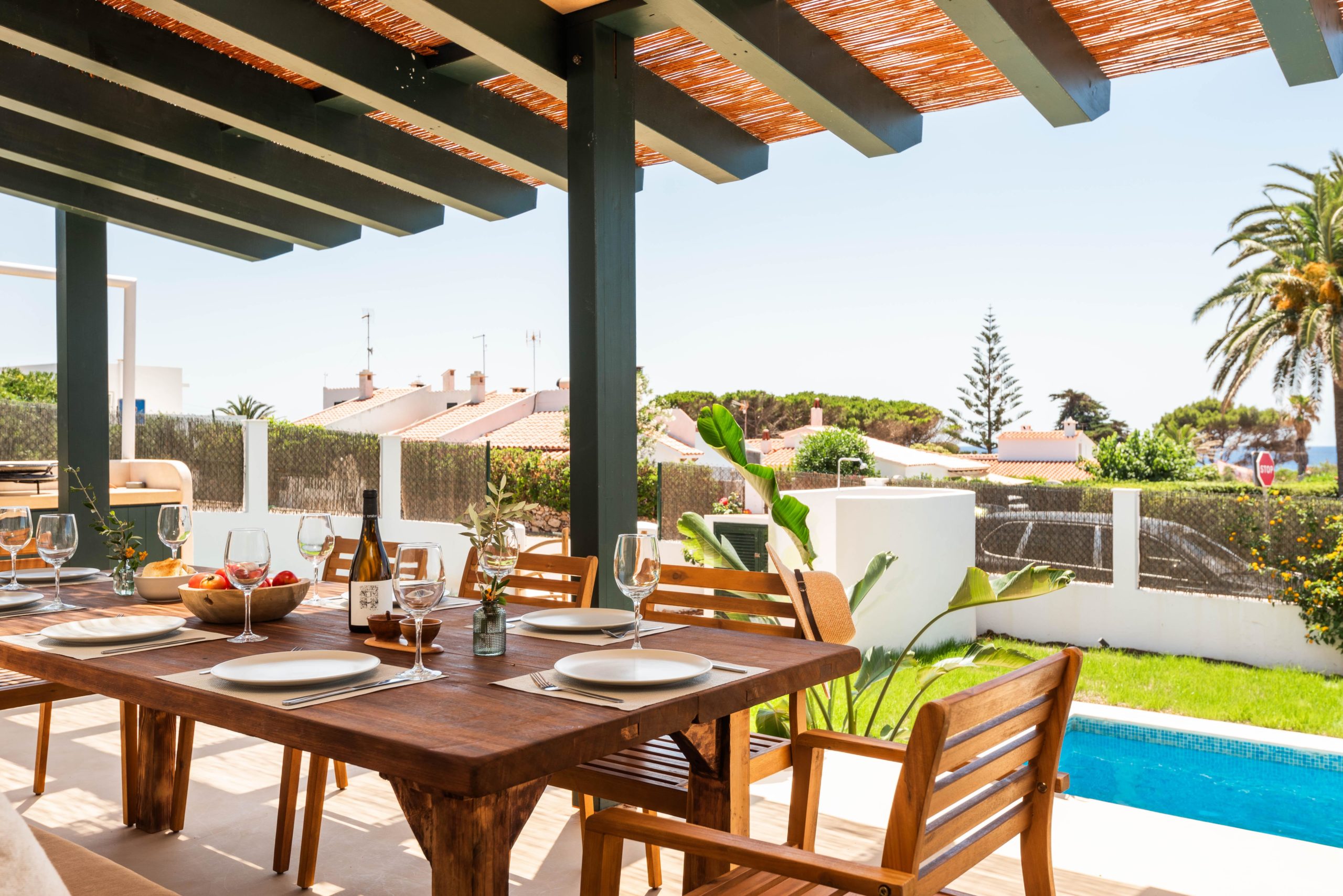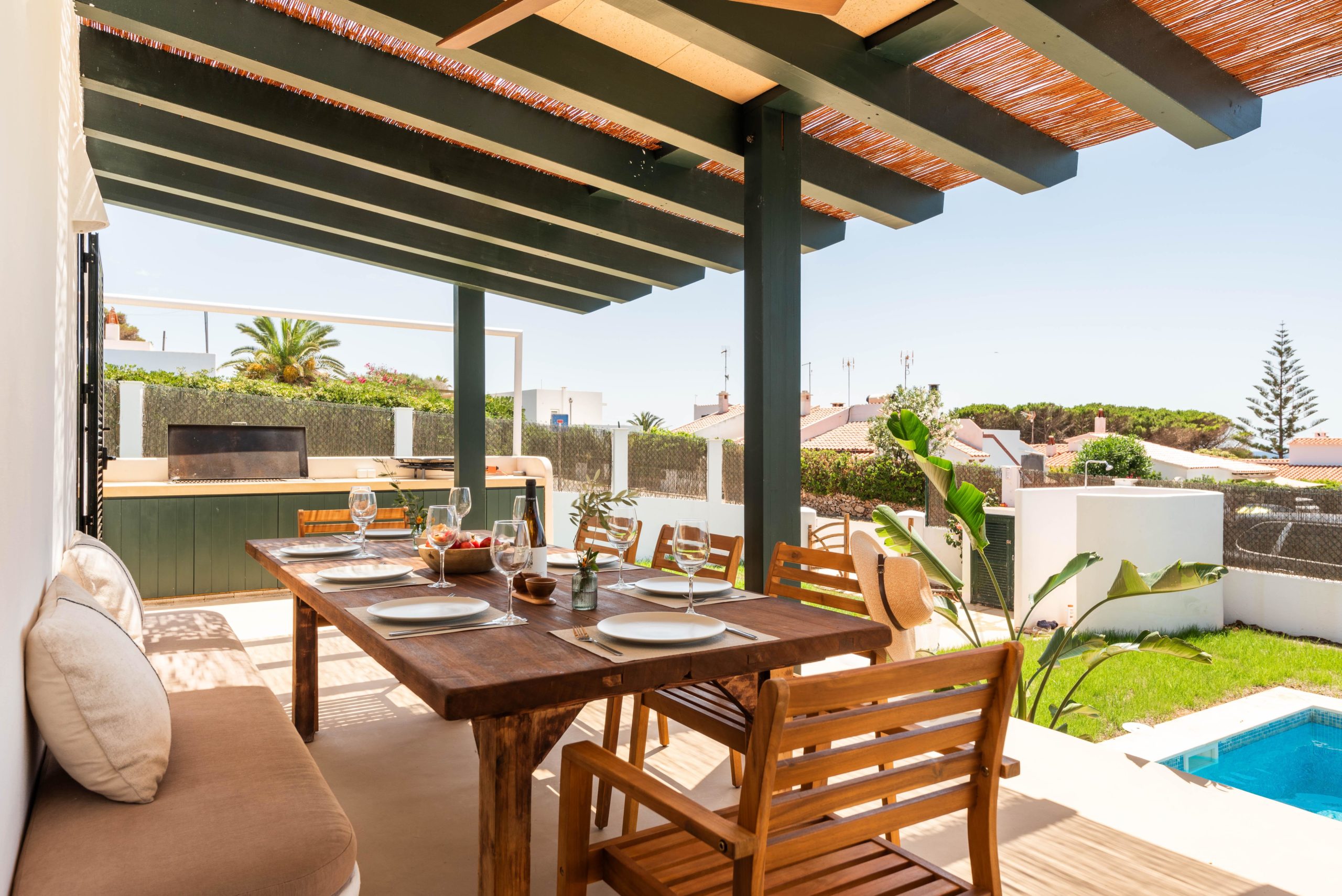 Le salon dispose d'internet, des chaînes satellite et d'une grande télévision pour vos moments de divertissement. Depuis le porche, des escaliers comme des marches vous mèneront directement à la piscine, créant un sentiment d'intégration absolue entre les espaces. La villa est spécialement conçue pour les adultes ou les enfants sous surveillance, car les escaliers sont très proches de la piscine. Le jardin dispose également d'une douche extérieure minorquine qui rend votre séjour encore plus confortable. À seulement 4 kilomètres, vous pourrez visiter la belle plage de Binibeca Nou et le célèbre village de pêcheurs de Binibeca Vell. La ville la plus proche est San Luis, située à 5 kilomètres, et l'aéroport est à seulement 11 kilomètres, vous pourrez donc entendre le bruit des avions.