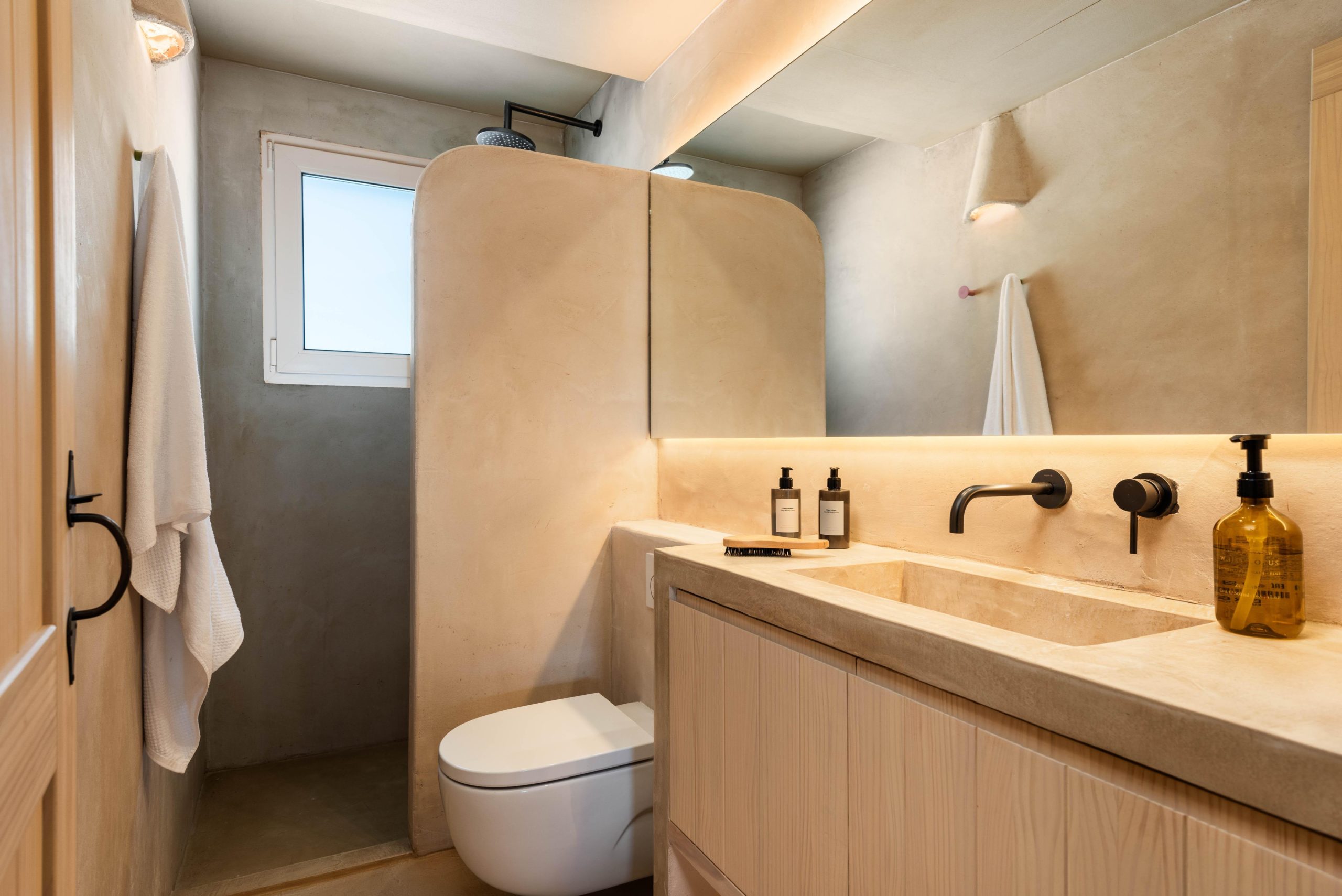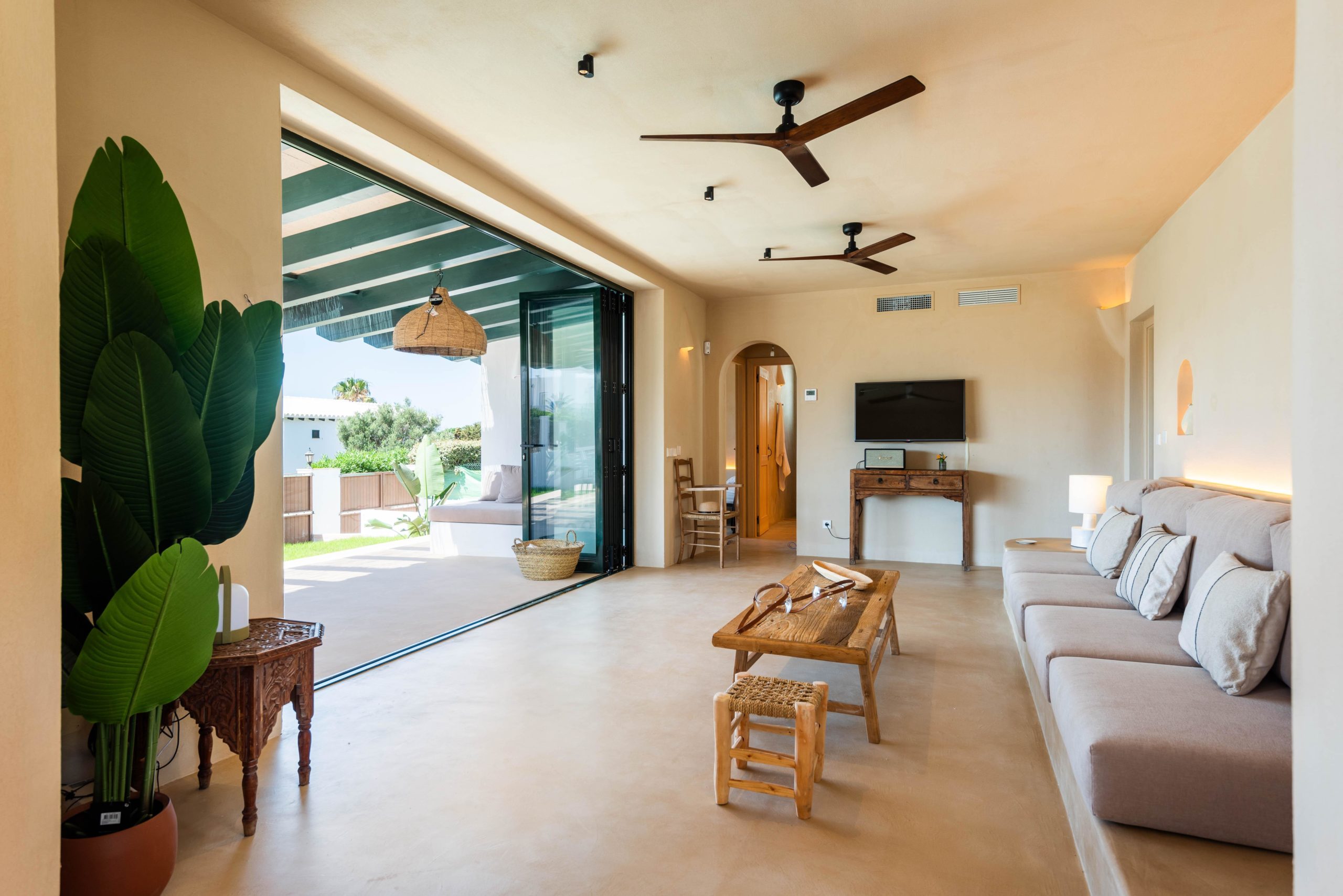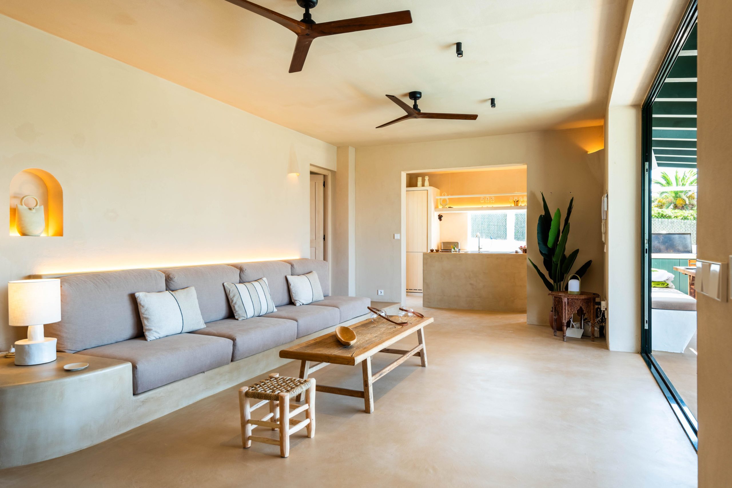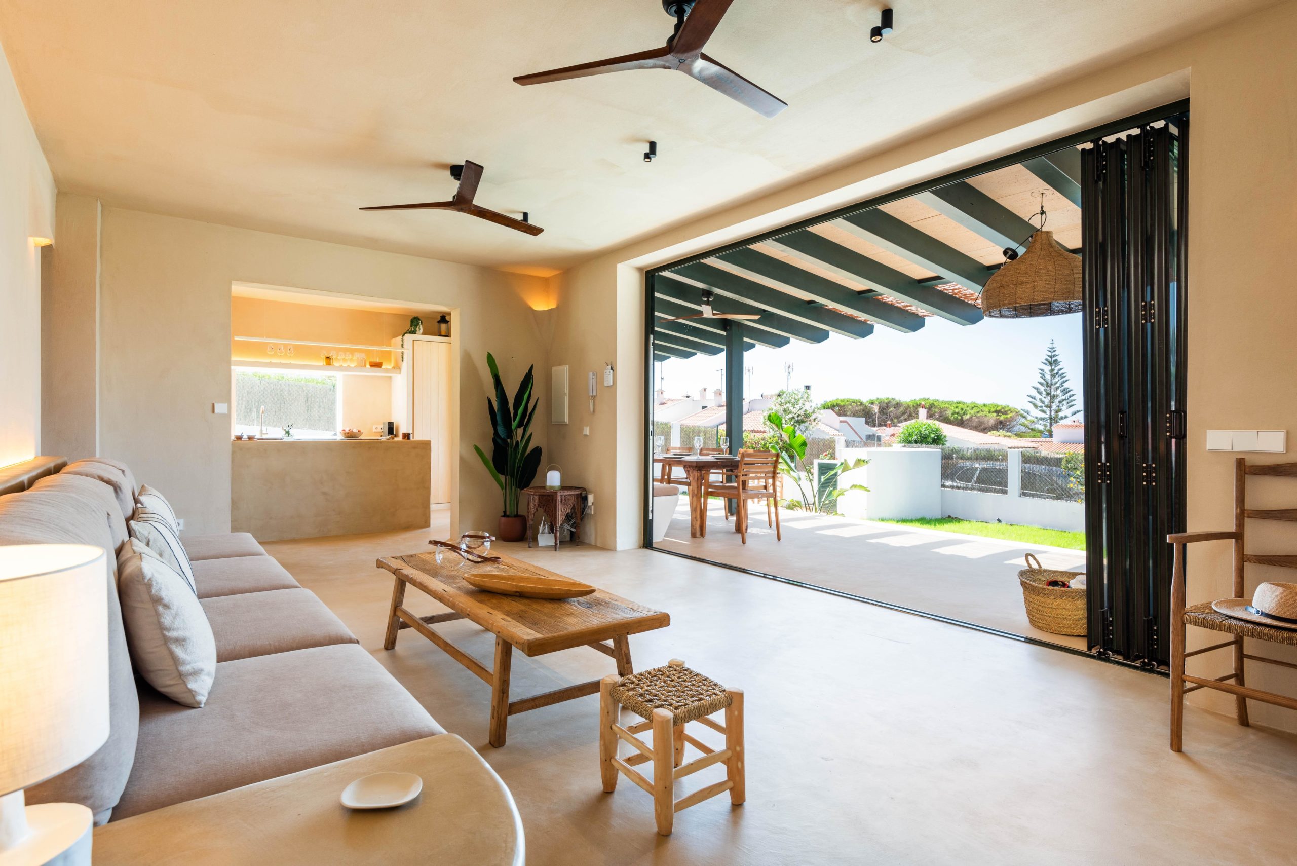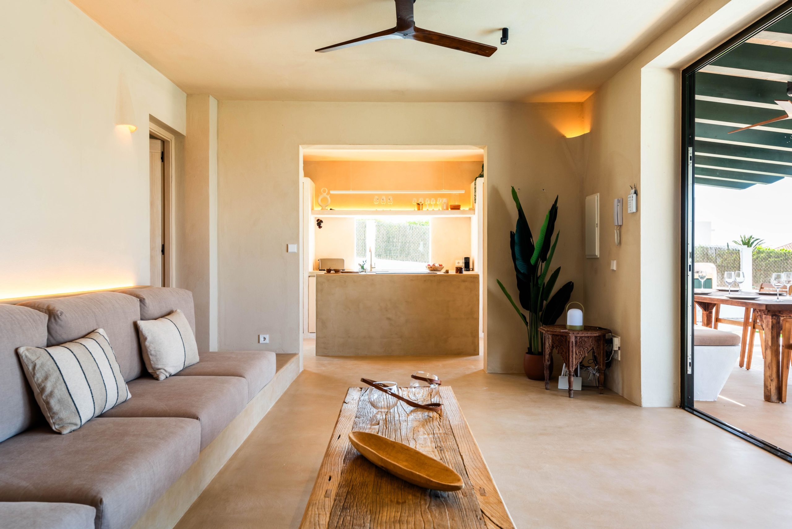 Le salon est un espace spacieux et lumineux où un grand canapé invite à la détente. Il est accolé à une cuisine ouverte intégrant les deux espaces. *De plus, le salon et la cuisine s'ouvrent complètement sur un grand porche, créant une seule pièce.* Sur ce grand porche, vous trouverez une table et un canapé confortable où vous pourrez profiter de merveilleux dîners et repas. Chaque recoin de BiniMadi dégage une atmosphère méditerranéenne et chaleureuse. Toutes les chambres disposent de la climatisation et également de ventilateurs de plafond qui vous permettent de profiter d'une légère brise toute la journée sans surchauffer. L'utilisation de béton ciré de couleur sable à l'intérieur et à l'extérieur de la maison unifie les deux espaces, créant un lien spécial avec l'environnement et donnant une touche unique et spéciale à cette villa.